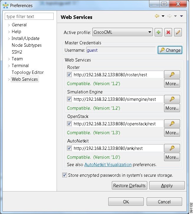 The next step is to configure the Cisco Modeling Labs client to communicate with the Cisco Modeling Labs server, as described in the section Creating a Web Services Profile.