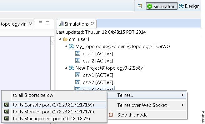The Cisco Modeling Labs client is a powerful cross-platform user interface for creating and editing topologies, and simulating those topologies on the Cisco Modeling Labs server. You can quickly create and edit complex topologies using a graphical point-and-click editor. You can also interact directly with your running simulations from the user interface.