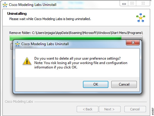 | Step 2 | Browse to the installation location and click uninstaller.exe to uninstall the Cisco Modeling Labs 1.1 client. | ||