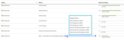 Moving away from the tile layout. Prior to release 6.1(4), all the entries were available as tiles, now a table has been introduced for the Fabric Capacity and Leaf Switch Capacity sub-tabs. The metrics which were earlier displayed as tiles are available in the table. Some of the earlier tile entries, for the Fabric Capacity sub-tab, such as endpoint details, are now available only when you click Details in the MAC + IP Endpoints row.