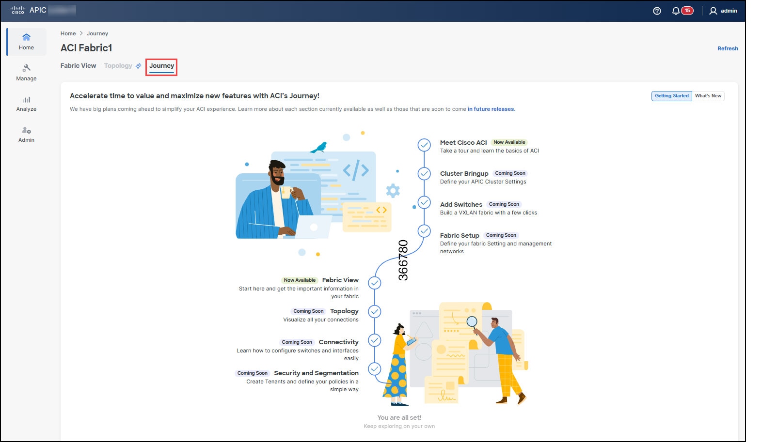 Journey: Shows the main functionalities of Cisco APIC, displays the execution plan for the new GUI, and provides a preview of upcoming features and their functionality.