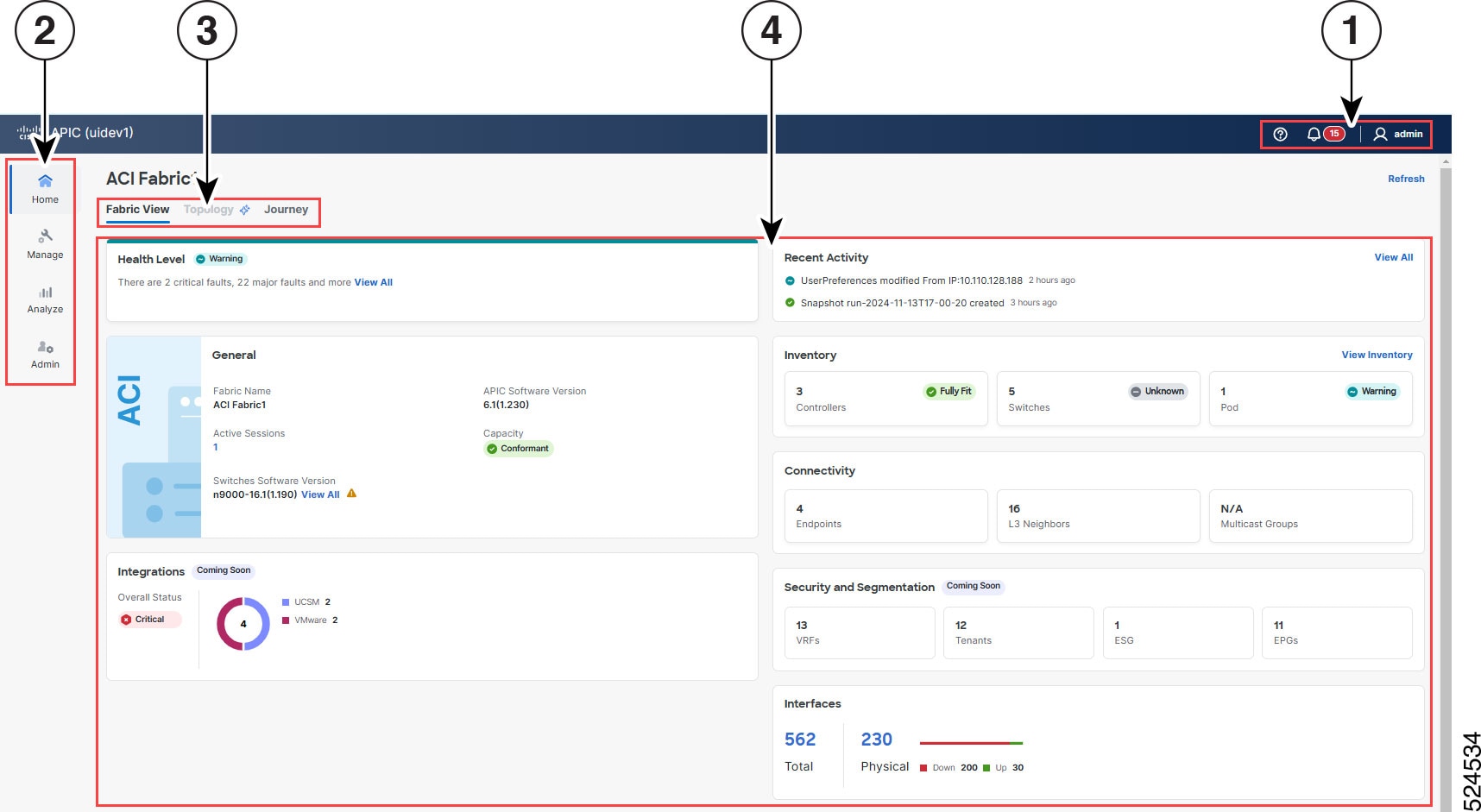 This topic explains the updated layout and core navigation areas of the modernized interface. It describes how to access system tools, manage fabric inventory, and utilize the User Journey feature to explore upcoming functionalities and track configuration progress.