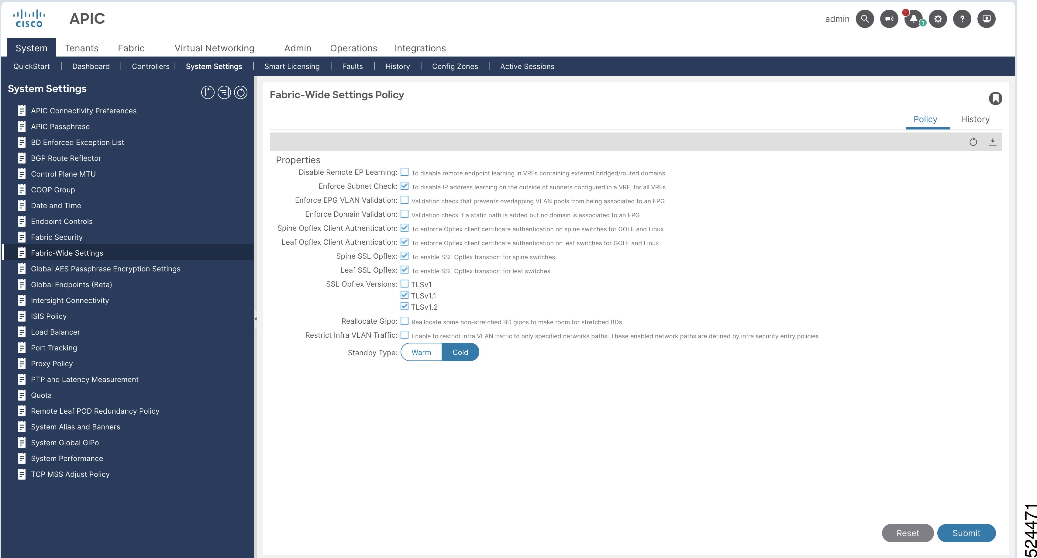 | 2. | In the Fabric Wide Settings Policy page, select Warm or Cold as the Standby Type.