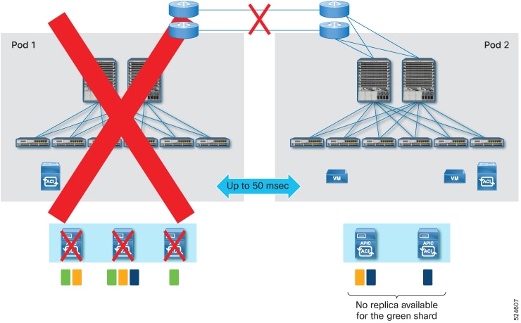 Data loss scenario 1: In a multi-pod deployment where you have APIC 1, 2, and 3 in Pod 1 and APIC 4 and 5 in Pod 2, if Pod 1 goes down because of a disaster, such as flood, fire, earthquake, and so on, three APIC nodes are lost. This means some database shards are completely lost.