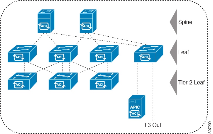 While the topology in the image shows the Cisco APIC and L3Out/EPG connected to the leaf aggregation layer, the tier-2 leaf access layer also supports connectivity to APICs and L3Out/EPGs.