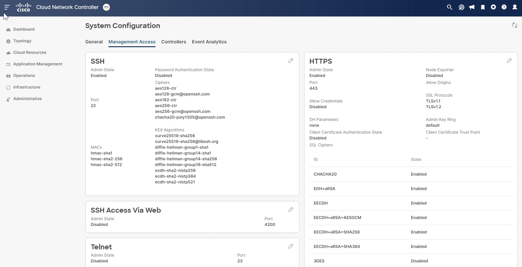 In the Cisco Cloud Network Controller GUI, navigate to , then click on the Management Access tab. |