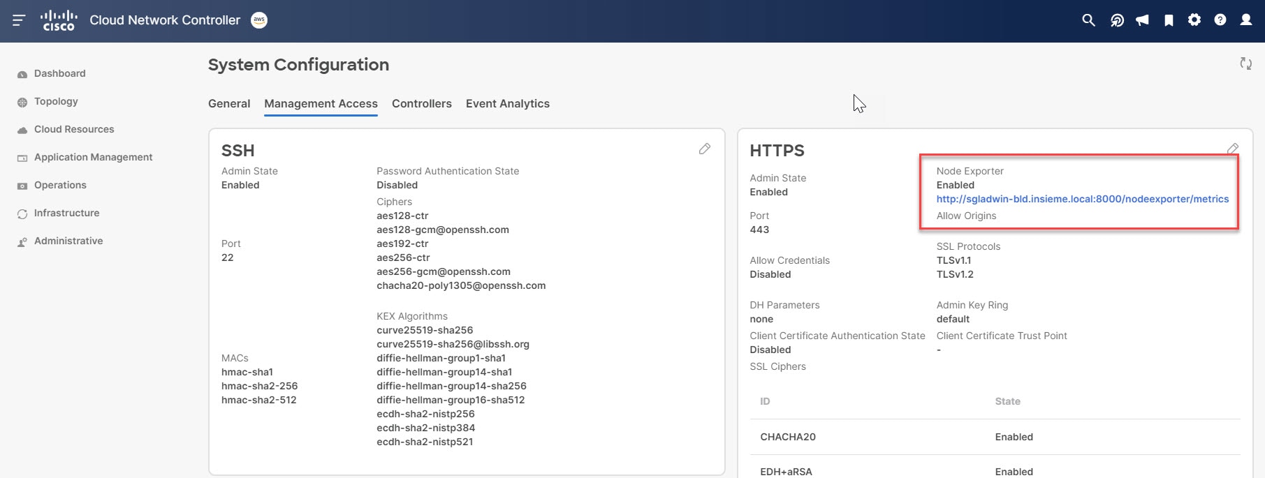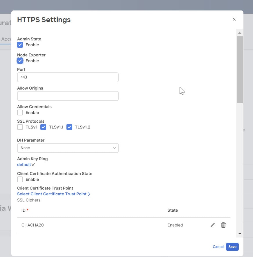 In the HTTPS area to the right of the window, verify that the entry in the Node Exporter field is set to Enabled. This verifies that the Prometheus Node Exporter is enabled.
