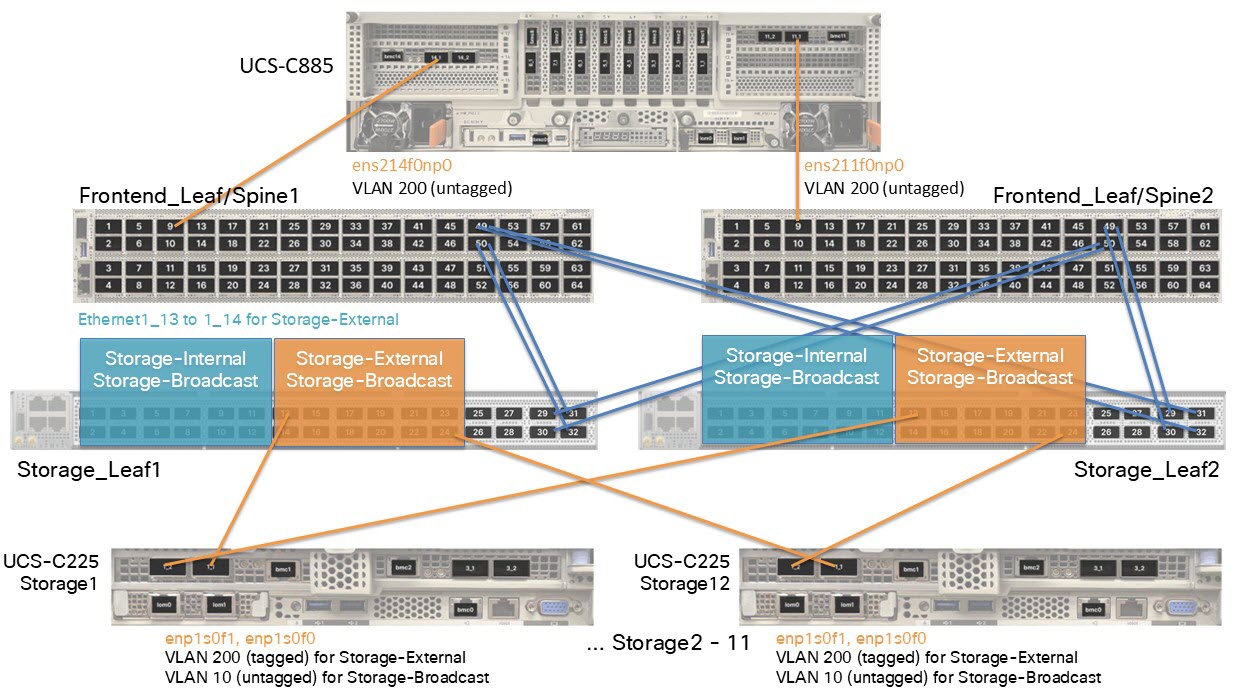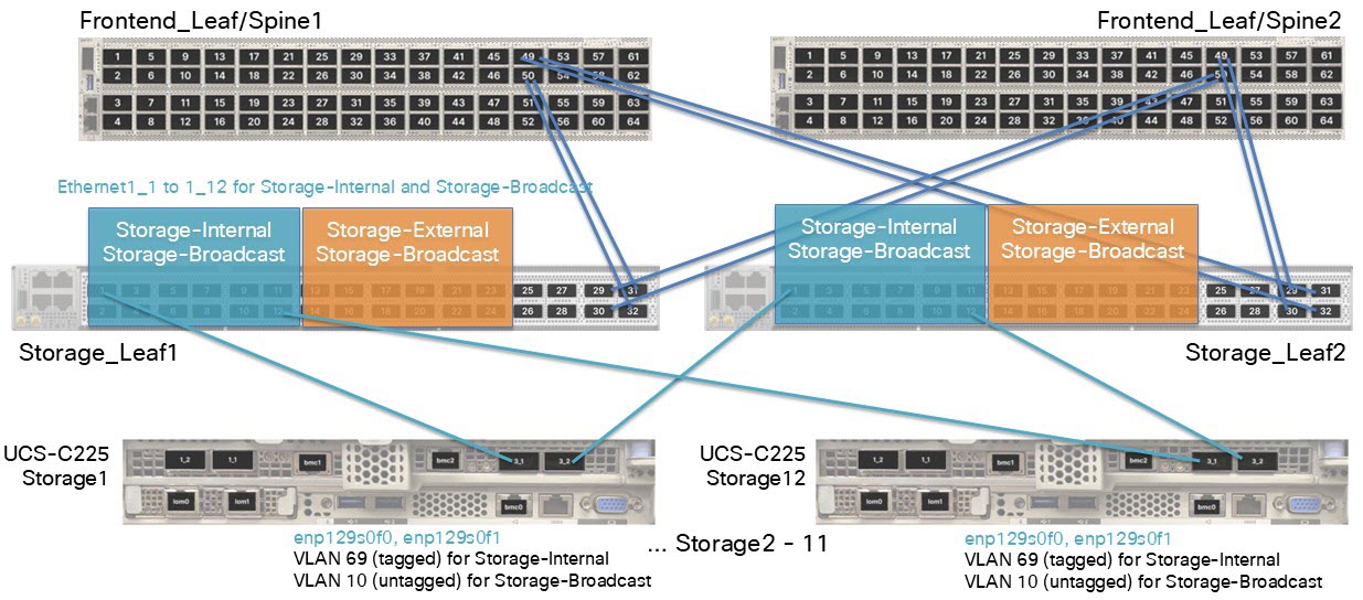 - The table assumes 12 servers. You must use different leaf switch port ranges depending on the number of servers for your configuration. For example, if you have 11 servers, the Storage-Internal ports would be Ethernet1_1 to Ethernet1_11, the Storage-Broadcast ports would be Ethernet1_1 to Ethernet1_22, and the Storage-External ports would be Ethernet1_12 to Ethernet1_22.