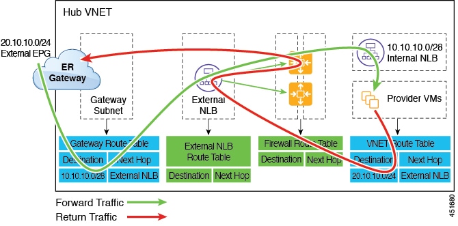 The following figure shows an example of a redirect for express route gateway to the provider EPG in the hub VNet.