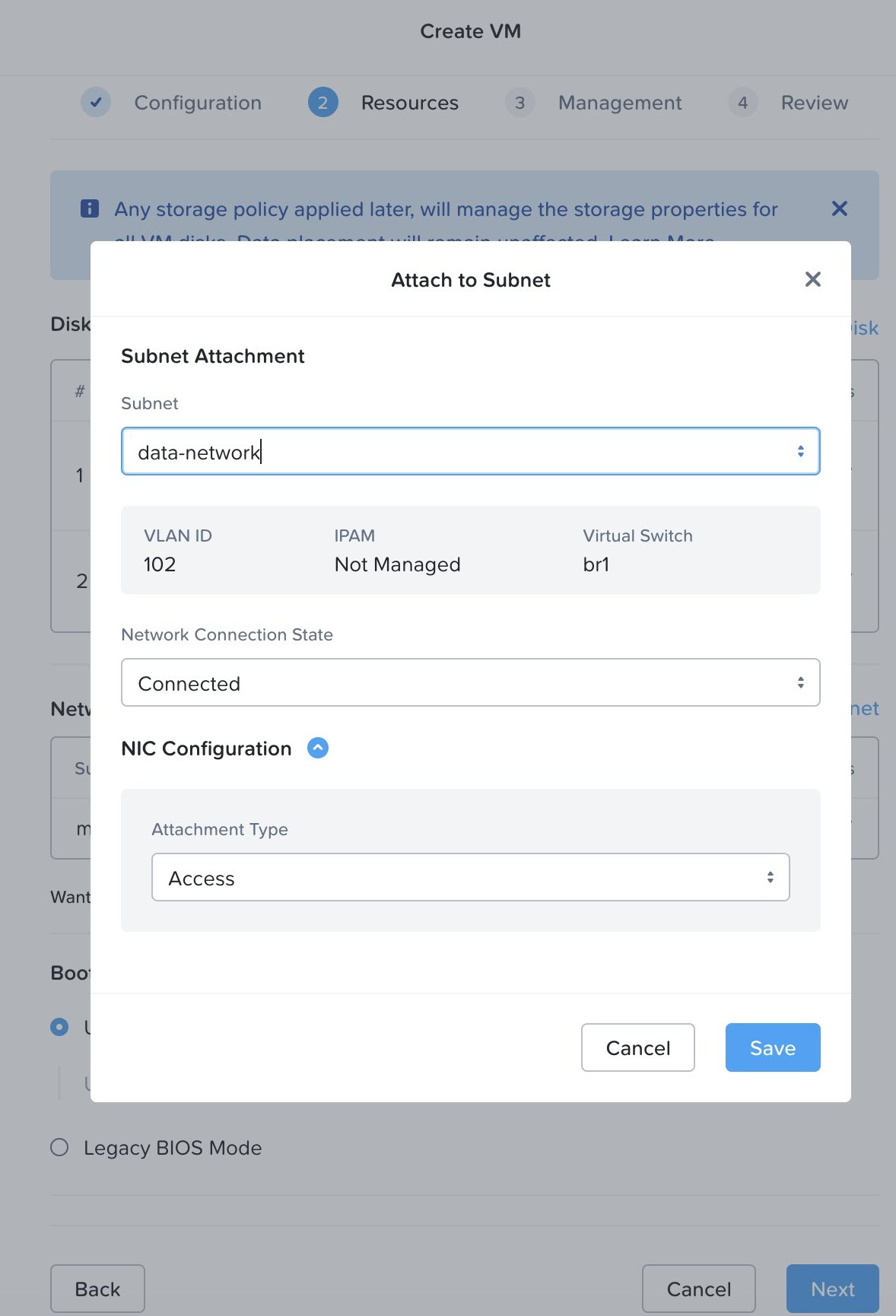 Deployment of virtual Nexus Dashboard (vNDs) in Nutanix is supported only on data nodes, as shown below. Deployment of vNDs