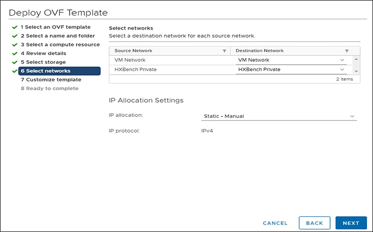 During OVA deployment, map NIC-2 of the HxBench Controller to the newly created HxBench Private Port Group.