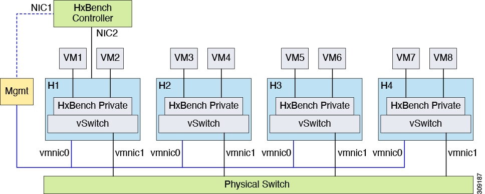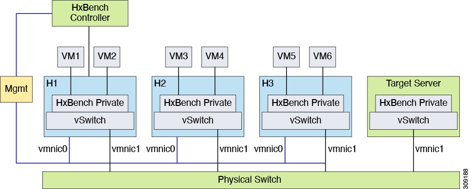 For a datacenter or cluster with multiple hosts, segment the network that connects to subordinate VMs as shown in the figure below. The HxBench Controller assigns static IP addresses to the test VMs and provides IP addresses to the subordinate VMs.