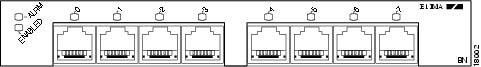 The eight DS1/E1 interface receptacles on the PA-A3-IMA are RJ-45 connectors for T1 (100 ohm) or E1 (120 ohm). All eight may be used simultaneously as ATM interfaces, or they may be used to create IMA groups.