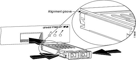 Locate the alignment groove on the GBIC. (See the enlargement in Figure 4-3.) Position the GBIC so that this groove is in the position shown in the enlargement, to ensure that the 20-pin plug on the GBIC is in the correct position.
