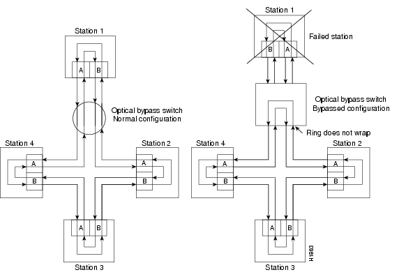 The optical bypass switch reroutes the light signal by intercepting it before it reaches the failed Station 1 and sends it back out to the ring. This rerouting allows the signal to maintain its existing path and direction without wrapping back on itself. However, stations that are operating normally repeat the signal when sending it back out to the ring. Optical bypass switches do not repeat or drive the signal (they just allow the signal to pass through them), so significant signal loss can occur when the downstream neighbor (the next station on the ring) is far away.