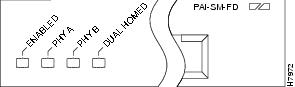 The PA-F/FD contains the enabled LED, which is standard on all port adapters, and status LEDs for each port. After system initialization, the enabled LED goes on to indicate that the port adapter has been enabled for operation. (The LEDs are shown in .) The LEDs on both the PA-F/FD-SM and the PA-F/FD-MM are identical to the LEDs shown in and are described in Table 1-3.