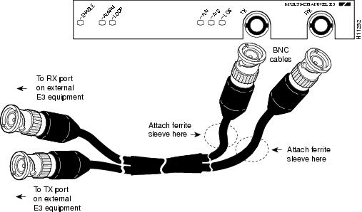 You must attach the ferrite sleeves (included with the PA-MC-E3 and shown in the "Cables, Connectors, and Pinouts" section on page 1-5) to the 75-ohm coaxial cables that you supply and plan to use for your E3 connections. Attach each ferrite sleeve as close as possible to the port adapter end of each 75-ohm coaxial cable. (See Figure 3-3.)