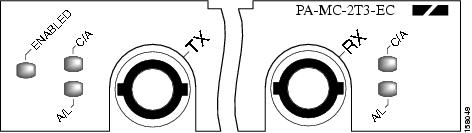 The PA-MC-T3-EC has three status LEDs located on its faceplate: one ENABLED LED, and an A/L (active/loopback) LED, and C/A (carrier/alarm) LED for each port.