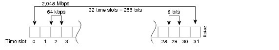 Each of the 32 time slots is an 8-bit frame that transmits data at 64 kbps. Each of these time slots can be configured to carry data or to remain empty. (The PA-4E1G inserts an idle pattern into empty time slots.)
