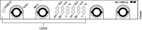 The two-port PA-2E3 has one status LED and six uplink port status LEDs (RCLK, FERF, OOF, AIS, RL, and LL) for each serial E3 port. (See Figure 1-4.)