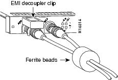 For E3 (75-ohm) connections, you must have ferrite beads on the 75-ohm coaxial cable and EMI decoupling clips on the receive end of the cable (see Figure 1-5) if compliance with European certification standards for emission control is required (EN55022/CISPR22 Class B for radiated emission levels).