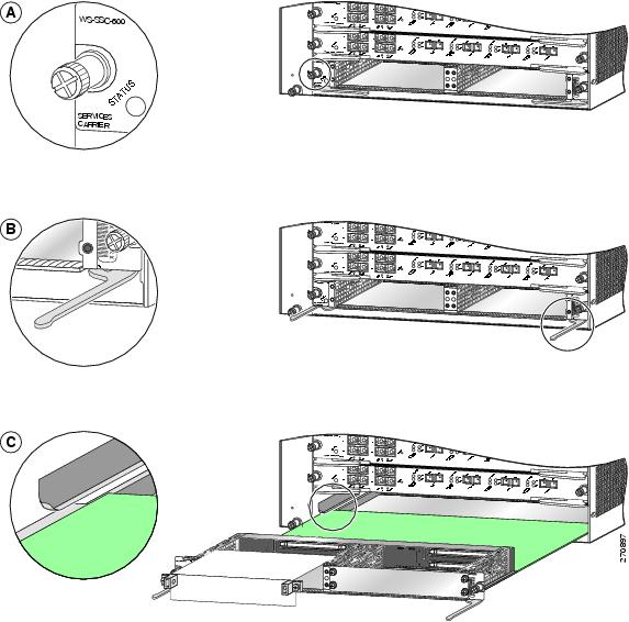 Figure 3-2 illustrates how to install and remove the SSC-600 in a Catalyst 6500 Series switch.