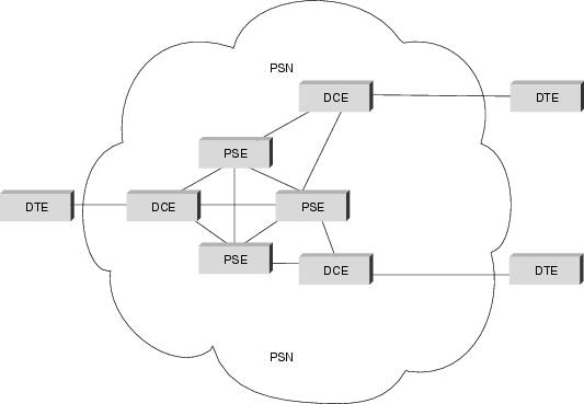 The X.25 specification defines a point-to-point interaction between data terminal equipment (DTE) and data circuit-terminating equipment (DCE). DTEs (terminals and hosts in the user's facilities) connect to DCEs (modems, packet switches, and other ports into the PDN, generally located in the carrier's facilities), which connect to packet-switching exchanges (PSEs, or switches) and other DCEs inside a PSN and, ultimately, to another DTE. The relationship between the entities in an X.25 network is shown in Figure 19-1.