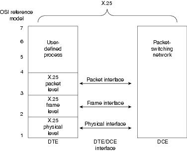 The X.25 specification maps to Layers 1 through 3 of the OSI reference model. Layer 3 X.25 describes packet formats and packet exchange procedures between peer Layer 3 entities. Layer 2 X.25 is implemented by Link Access Procedure, Balanced (LAPB). LAPB defines packet framing for the DTE/DCE link. Layer 1 X.25 defines the electrical and mechanical procedures for activating and deactivating the physical medium connecting the DTE and the DCE. This relationship is shown in Figure 19-2. Note that Layers 2 and 3 are also referred to as the ISO standards ISO 7776 (LAPB) and ISO 8208 (X.25 packet layer).