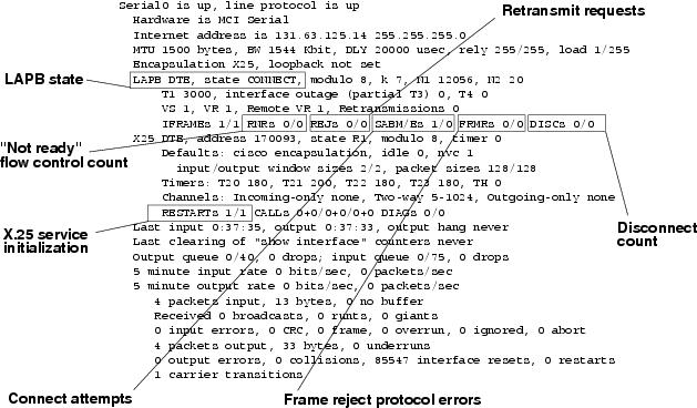 The show interfaces serial command provides important information useful for identifying problems in X.25 internetworks. The following fields provide especially important information: