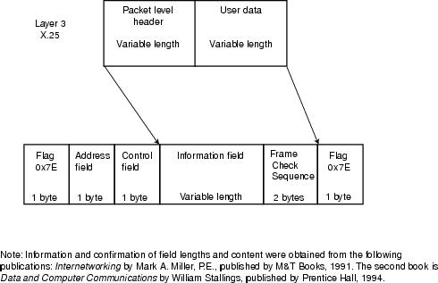 An X.25 frame is composed of a series of fields, as shown in Figure 19-3. Layer 3 X.25 fields make up an X.25 packet and include a header and user data. Layer 2 X.25 (LAPB) fields include frame-level control and addressing fields, the embedded Layer 3 packet, and a frame check sequence (FCS).