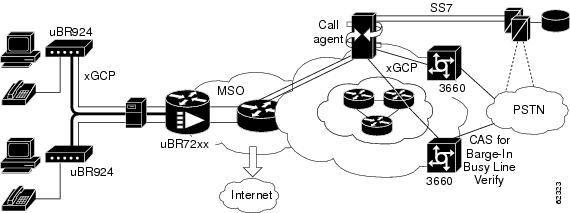 In the figure below, the trunking gateway (the Cisco 3660 platform) requires support of incoming and outgoing multi-frequency signaling for the barge-in and busy-line verify features. The residential gateway (the Cisco uBR924 cable access router) must support the CLASS features and 911 capability.