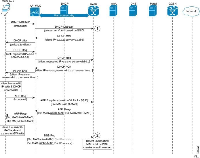 Subscriber connects to an open wireless local area network (WLAN) and gets an IP address from DHCP or the iWAG.