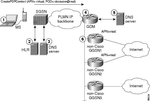 In the GDM environment using virtual APN support, a virtual APN is used to select the Cisco Systems GDM router. GDM facilitates the processing of the create PDP context request to the real APNs through the appropriate GGSNs. The GGSNs always provide the physical connectivity to the real target network.