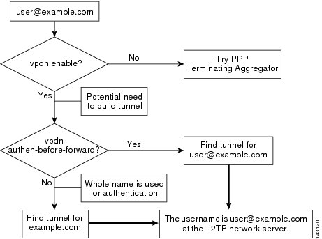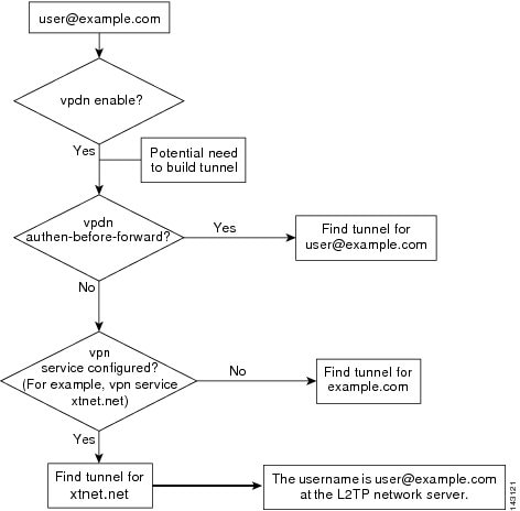 When a NAS is configured to forward VPDN calls on the basis of the user domain name, the user must use a username of the form username@domain. The NAS then compares the user domain name to the domain names it is configured to search for. When the NAS finds a match, it forwards the user call to the proper tunnel server.