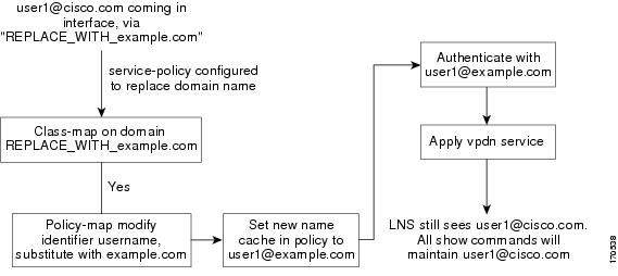 You can modify the domain portion of the username seamlessly when you enter into a Virtual Private Network (VPN) service. The L2TP Domain Screening feature ensures that the appropriate domain has been screened before access is allowed to an L2TP tunnel for the user session.