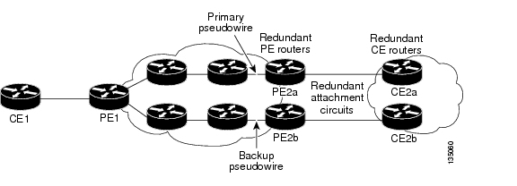 The L2VPN Pseudowire Redundancy feature enables you to set up backup pseudowires. You can configure the network with redundant pseudowires (PWs) and redundant network elements, which are shown in the following figures.