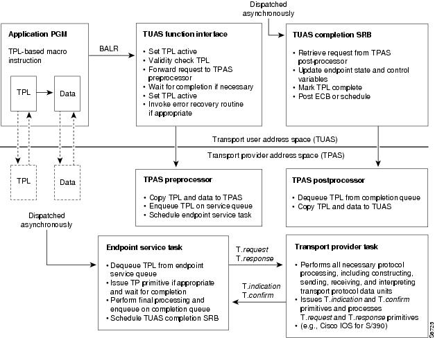 A service request requires processing in two MVS address spaces. The Transport User Address Space (TUAS) is the address space of the application program that initiates the request. The Transport Provider Address Space (TPAS) is the address space containing the API subsystem and the transport service provider that eventually processes the request. In some cases the transport provider may reside in an external device (for example, a specialized network I/O processor), and the transport provider depicted in this diagram is merely a stub that communicates with the external device. In either case, all other entities are present, and the actual location of the transport provider is transparent to the application program.