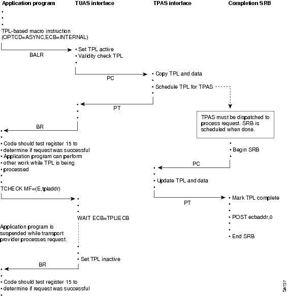 It is also important to note that the TPL ECB may be posted or the TPL exit routine may be executed before the application receives control back from the API (for example, at the next sequential instruction following the TLI request macro). This is because this activity occurs upon a different unit of execution within the operating system.