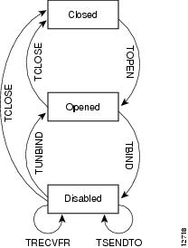 This state diagram reflects the simplicity of connectionless-mode service, which uses only closed, opened, and disabled states. All data transfer takes place in the disabled state. On completion of data transfer, the endpoint may be closed, returning it to the closed state, or the local protocol address may be unbound, returning the endpoint to the opened state. Establishing an association with a CLTS endpoint has similar state transitions to connection-mode.