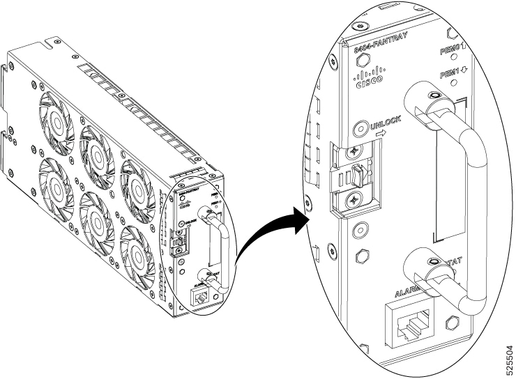The cabling for all interfaces (power, data and control) are on the front side of the chassis. The chassis grounding point is located on the rear side of the chassis.