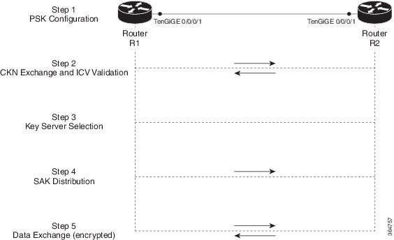 Link establishment and peer authentication: When two MACsec routers first connect, they establish a peer relationship. Both devices perform mutual authentication using a pre-shared key (PSK).