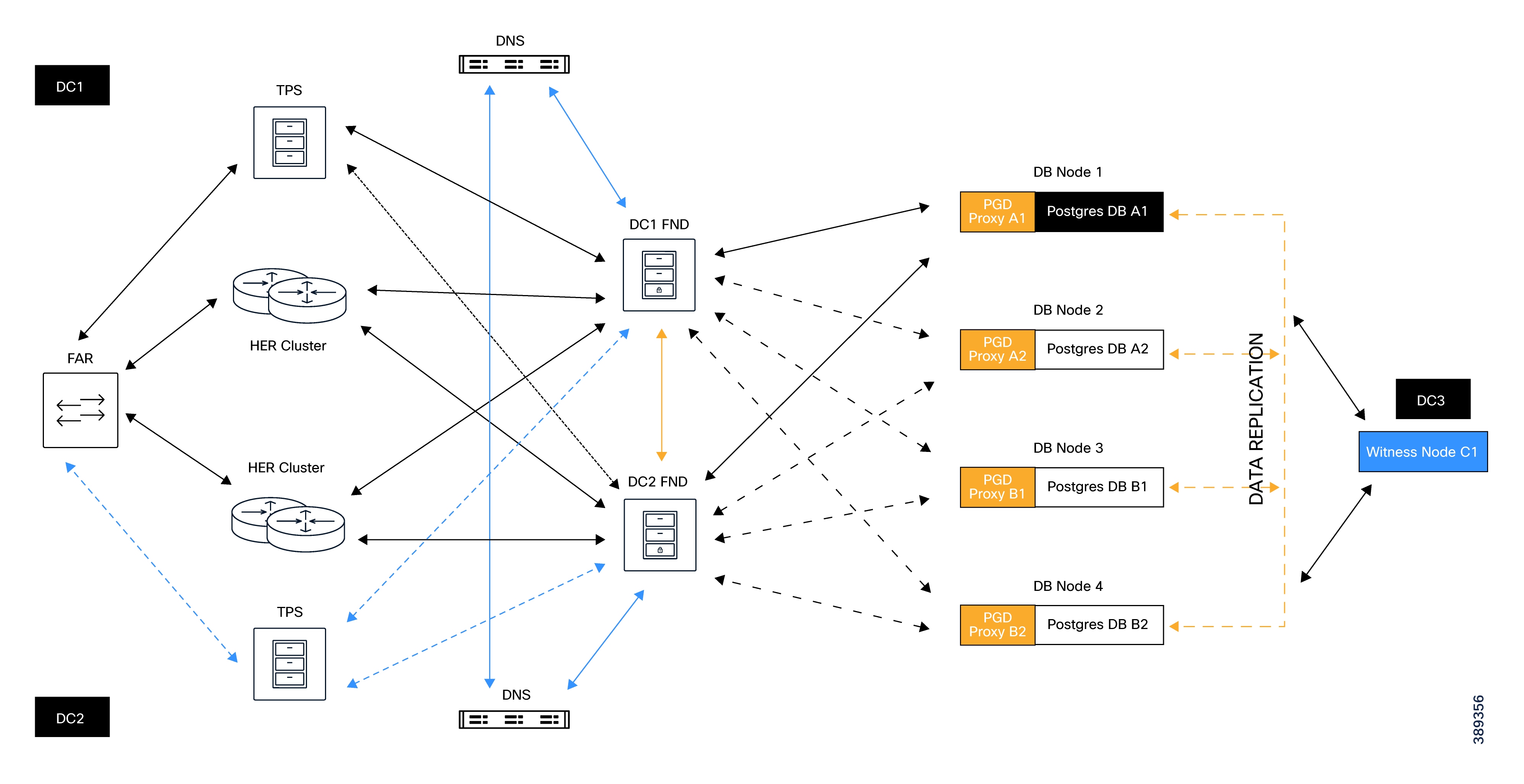 - Two FND application servers run in active mode and connect to the database through the PGD proxies, ensuring uninterrupted application access during database failover.