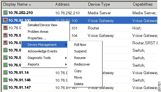 A context-sensitive menu is available on the web interface of the Devices tab. The context-sensitive menu comes up when you right-click a device or device group. This menu contains a list of tools that can be used on the device or device group. The type of tools that are available depends on the type of device you have selected. For more information on the standard network tools available, see Launching Network Tools, page 4-13.