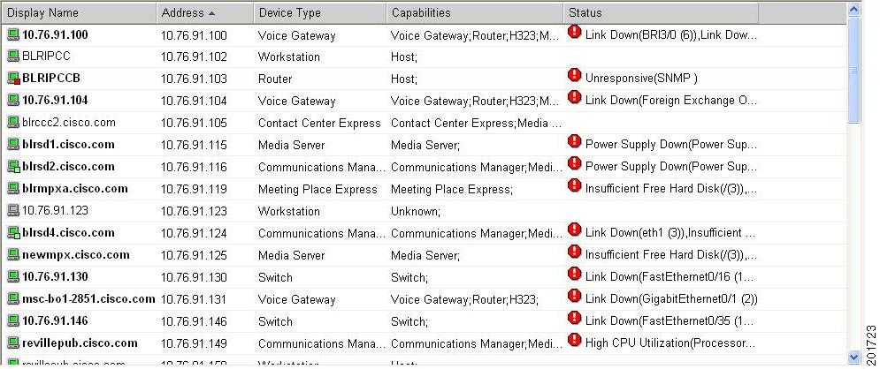 Each device on the list provides information about its device type, capabilities, and status. The Capabilities column indicates the different roles that the device is capable of. For example, if a device has the capability of being a router and an H323 gateway, the column would list both router and H323 gateway. The Status column describes any faults or events on the device. For a description of each event listed in the Status column, see Appendix A, "Events Processed.".