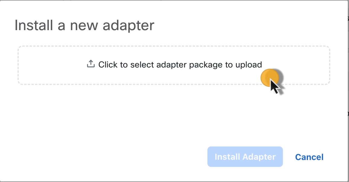 In the Install a new adapter modal, click on the file uploader to select an installable adapter file from your local machine and click Upload. You can find adapter files in the CWM software package. ![]()