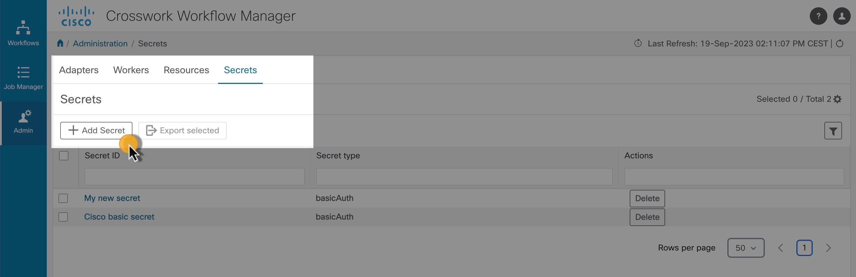 In CWM, go to the Admin -> Secrets tab. In the Secrets view, click Add Secret. |