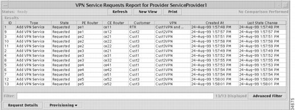 Choose List Service Requests to generate the VPN Service Requests Report that lists the service requests associated with the selected Region or PE.