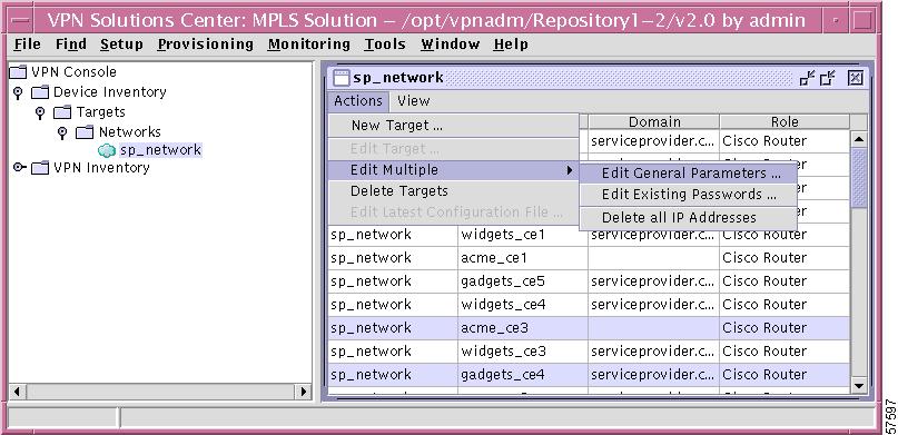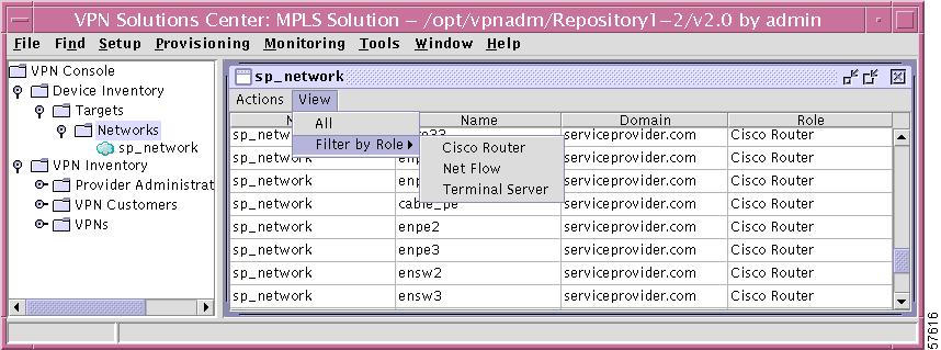 Cisco VPN Solutions Center: MPLS Solution is an MPLS VPN provisioning and auditing tool. The software focuses on the provider edge routers (PEs), customer edge routers (CEs), and the link between them. VPN Solutions Center software uses the Telnet Gateway Server (TGS) software to transport configuration file information to and from target routers. Additional features include Class of Service (CoS) provisioning, VPN-aware NetFlow accounting, and Service Level Agreement (SLA) monitoring.