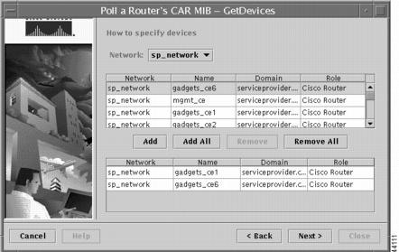 This dialog box has two panels. The upper panel displays the routers in the selected network. The lower panel will display the routers you want to be polled for CAR data.