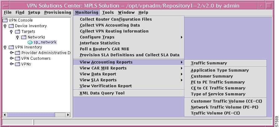 The VPN Console Monitoring menu shown in Figure 5-2 provides the menu options from which you can access the performance collection tasks and their corresponding reports.